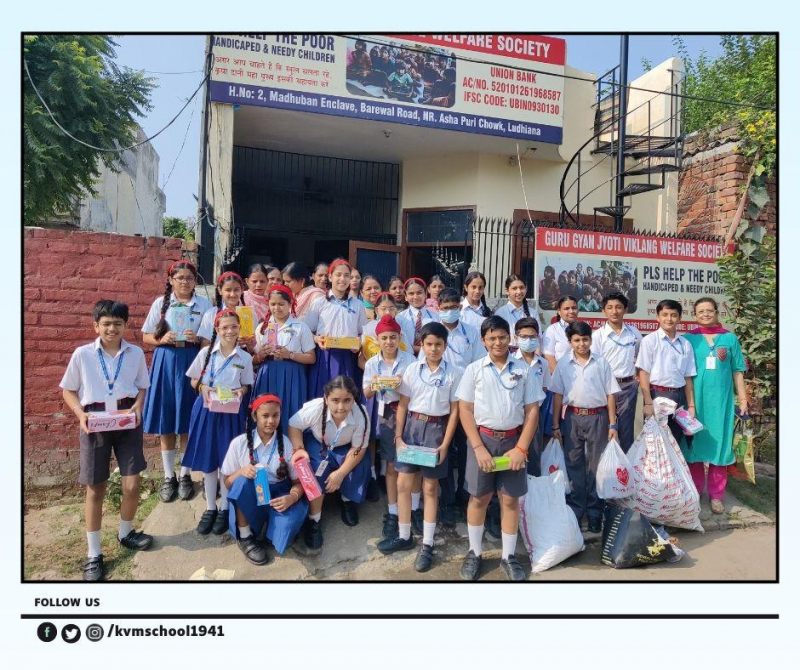 October 1, 2025, Ludhiana : In a heartwarming initiative, 21 students of Kundan Vidya Mandir Sr. Sec. School, accompanied by two teachers, Ms. Kalpana Sharma and Mrs. Sonia Dutta visited Guru Gyan Jyoti Viklang Welfare Society, Barewal today. The visit was organized under the theme “Sharing with Caring” with the aim of shaping young minds towards empathy, compassion, and social responsibility.
