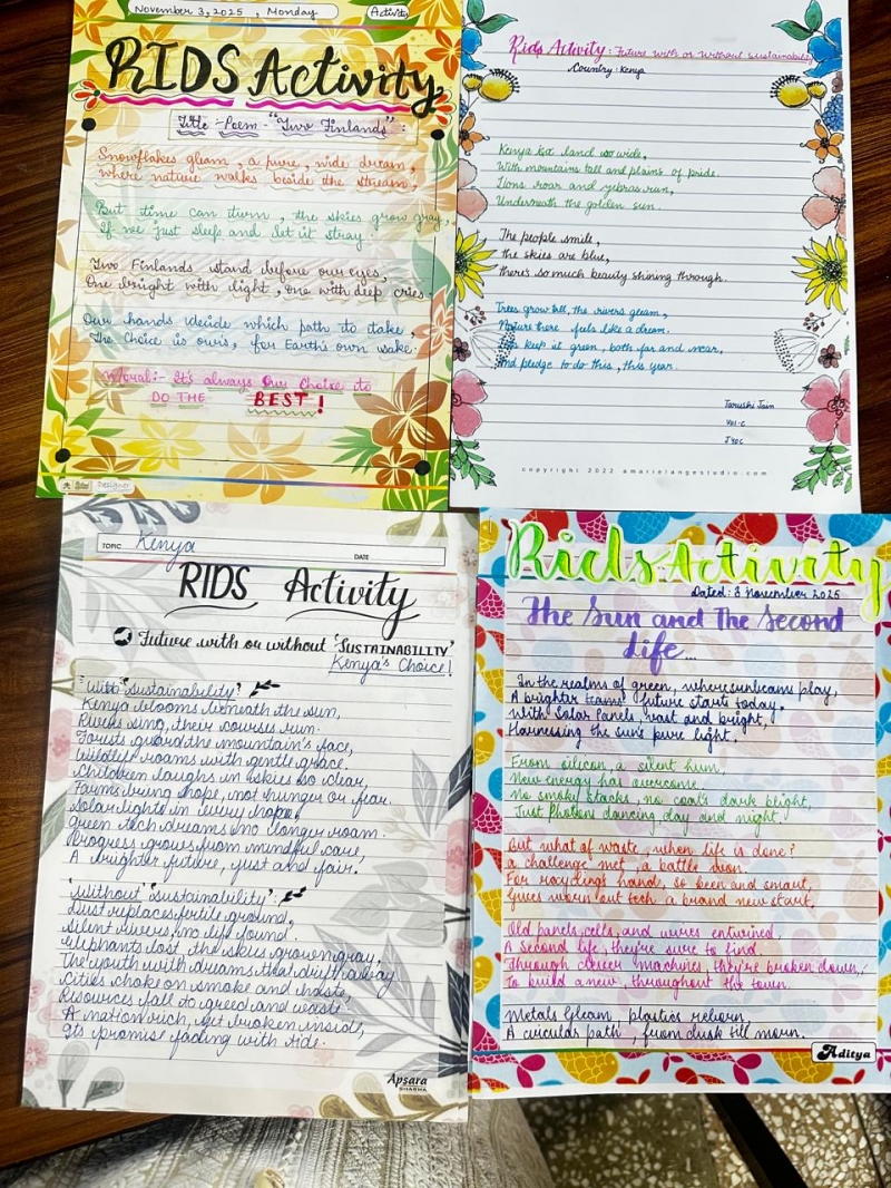 Under the British Council RIDS Programme, Kundan Vidya Mandir Sr. Sec. School organized a poem and story writing activity for students of Classes VI to VIII on the theme “A Future With or Without Sustainability.” Students explored and creatively expressed their ideas based on the sustainable practices of India, Finland, and Kenya, focusing on waste management, energy resources, and water conservation. The activity encouraged awareness about eco-friendly living and responsible global citizenship. It was a wonderful blend of creativity and learning, inspiring young minds to imagine a greener, cleaner, and sustainable future for the world.